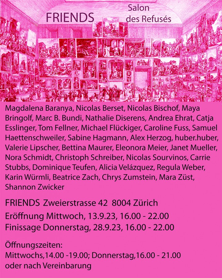 Der Salon des Refusés, oder Salon der Zurückgewiesenen, ist eine inoffizielle Parallelausstellung zur Werk- und Atelierstipendienausstellung der Stadt Zürich und wird am Mittwoch, den 13.9.23 im FRIENDS in Zürich eröffnet. Gezeigt werden Arbeiten von Künstler*innen, welche von der Jury der Stadt Zürich zurückgewiesen wurden. Für mehr Infos klick hier.